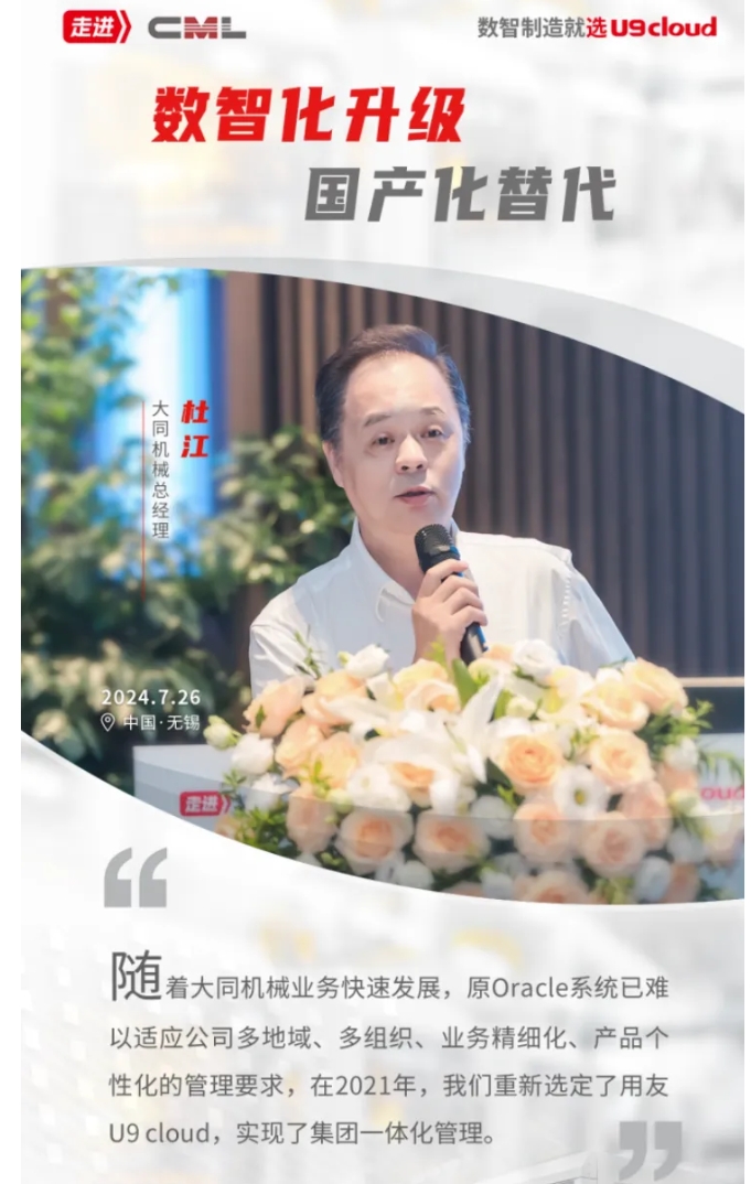 杜江先生强调,ERP系统的更新不仅仅是软件品牌和供应商的更换,更是一场流程再造和管理升级的过程。大同机械通过搭建以U9 cloud为基石的数智化创新管理平台,整合软硬件资源,助推公司整体管理水平迈上新的台阶。