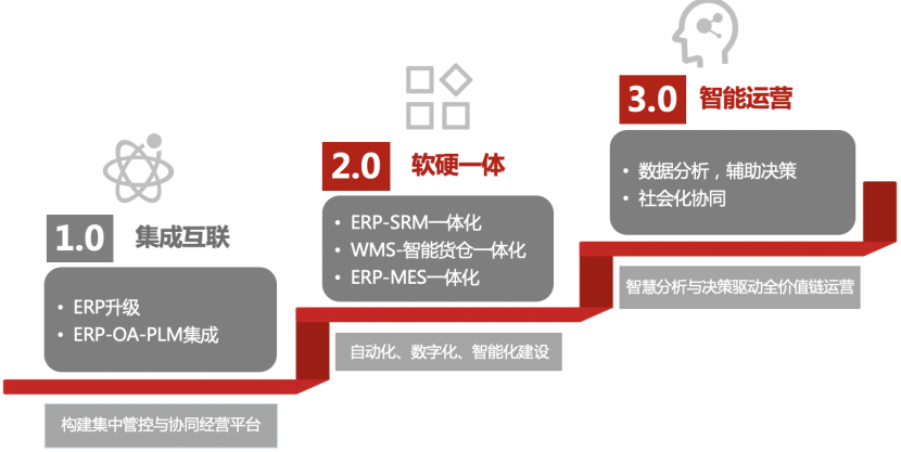 1.0 集成互联阶段:在这个阶段,企业实现了基础的信息化建设,通过ERP+OA+PLM的集成,构建了集中管控与协同经营的平台。这使得企业能够初步实现数据的集中管理和流程的自动化,为后续的数智化转型奠定了坚实的基础。