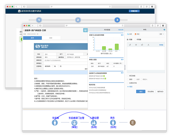 二元化工作流:实现刚性的制度与柔性的流程 相结合,实现快速审批。并且支持加签、减签、会签、知会、修改、 回退、撤销、终止、移交、转发、督办、关联、收藏、流程自动分 支、多条件分支策略,满足企业各种复杂流程处理状况。