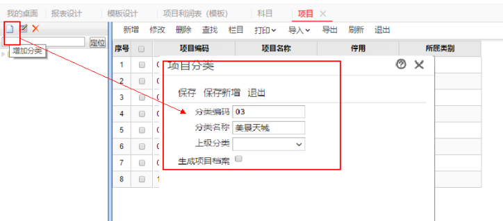 点击【基础设置】-【项目】-【增加分类】输入分类编码、分类名称添加一级分类进行保存: