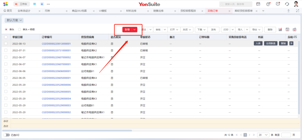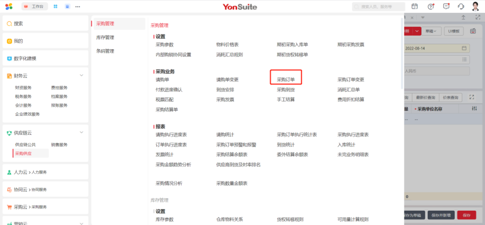 3.2.2流程测试-新增采购订单 路径:供应链云 > 采购供应 > 采购管理 > 采购业务