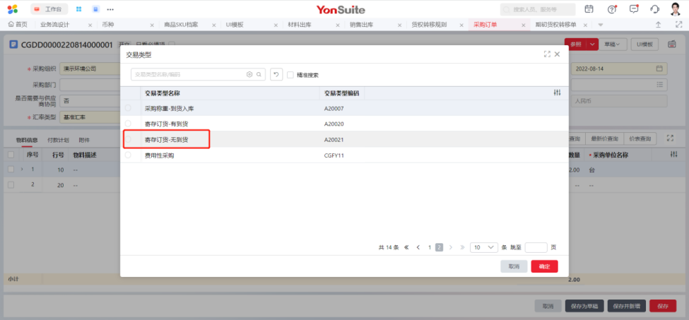 2. 采购订单交易类型选择“寄存订货-无到货”