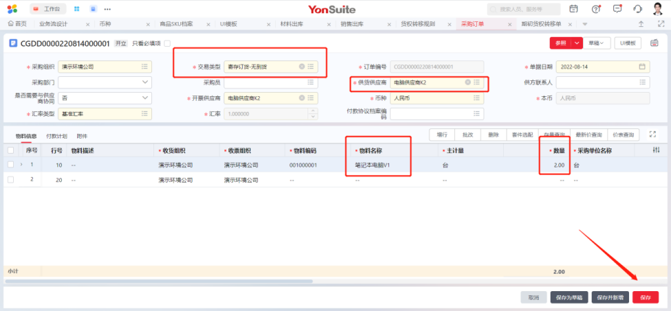 编辑采购订单信息,注意维护供应商信息,交易类型选择“寄存-无到货”