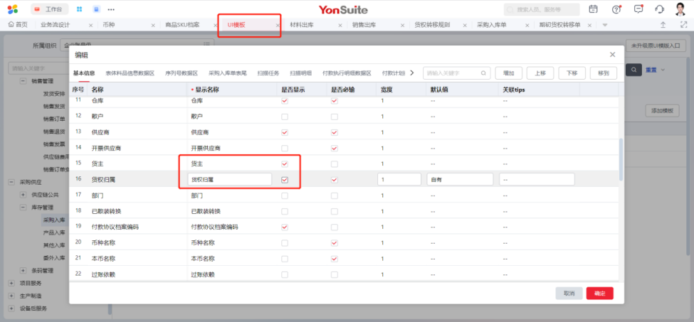 在UI模板当中,找到采购入库单,将“货主”和“货权归属”字段放出