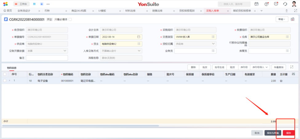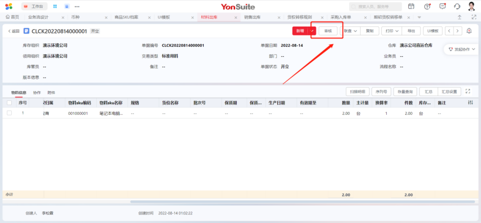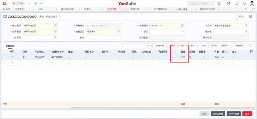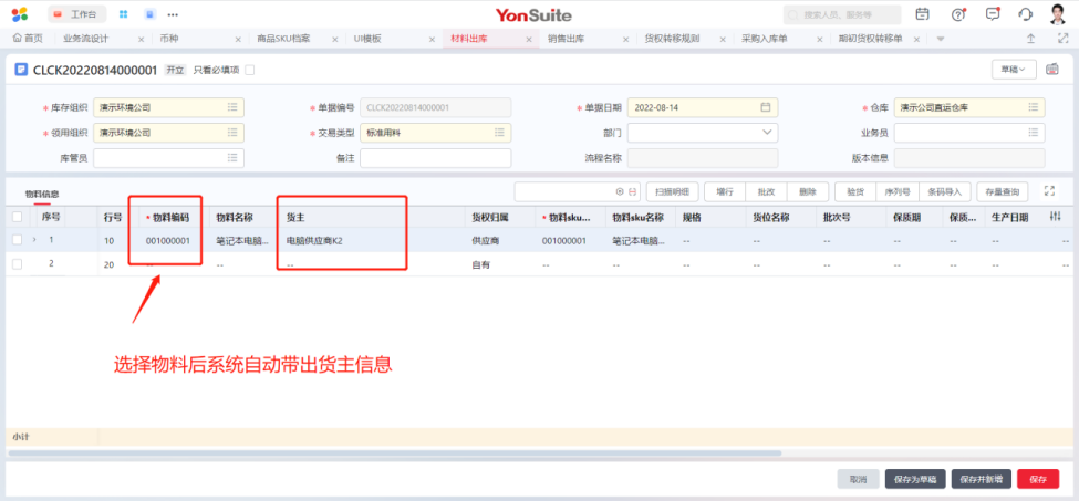 5. 新增材料出库单,选择对应的物料,保存审核后自动生成“货权转移单”