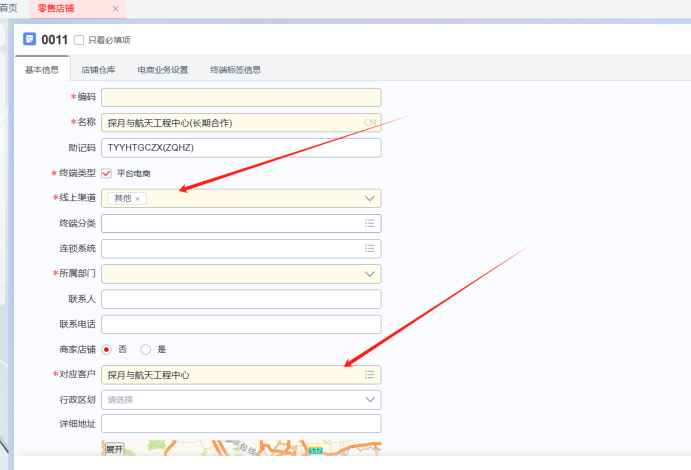 新增零售店铺,客户档案选择客户档案,将这个店铺绑定对应客户,线上渠道选择其它。