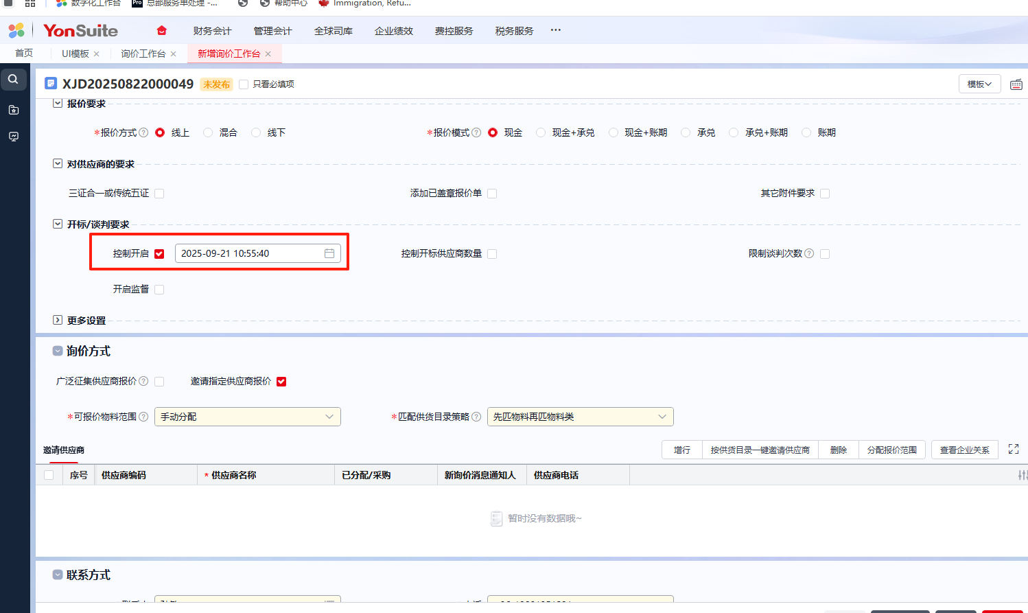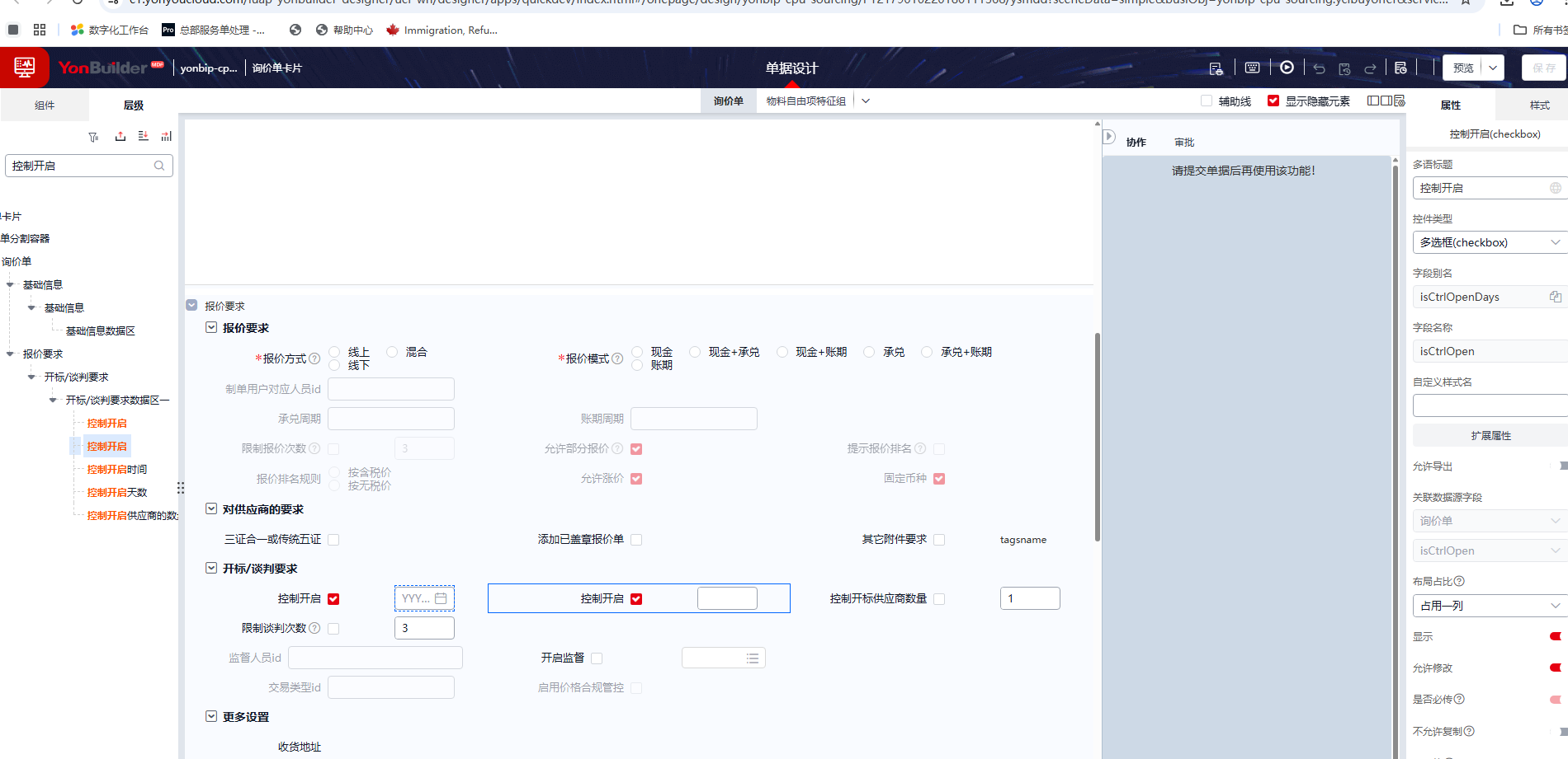 1、在询价单的UI模板上显示【控制开启】按钮,