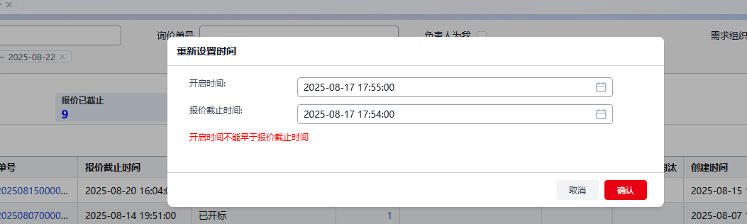 在询价单勾选【控制开启】字段(设置为"是"),此时必须维护【开启时间】字段(精确到分钟)