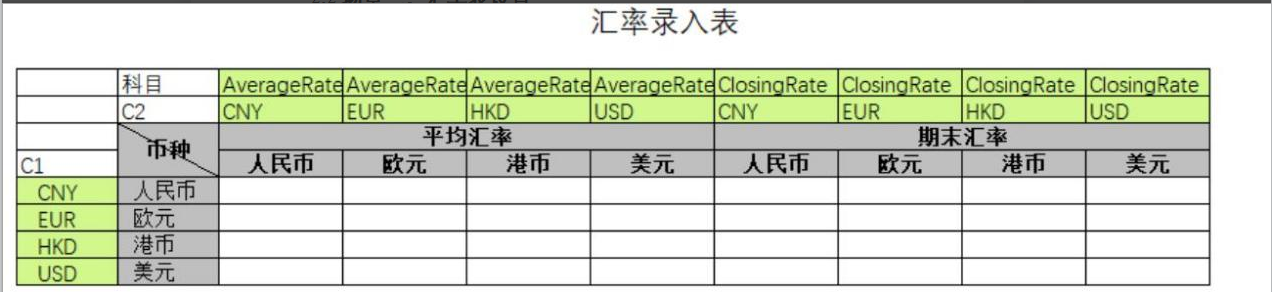 此间汇率表含有预制维度中的币种汇率设置;如需增加币种,则对表单设置增加相应币种,对应均需考虑“期末汇率”、“平均汇率”。