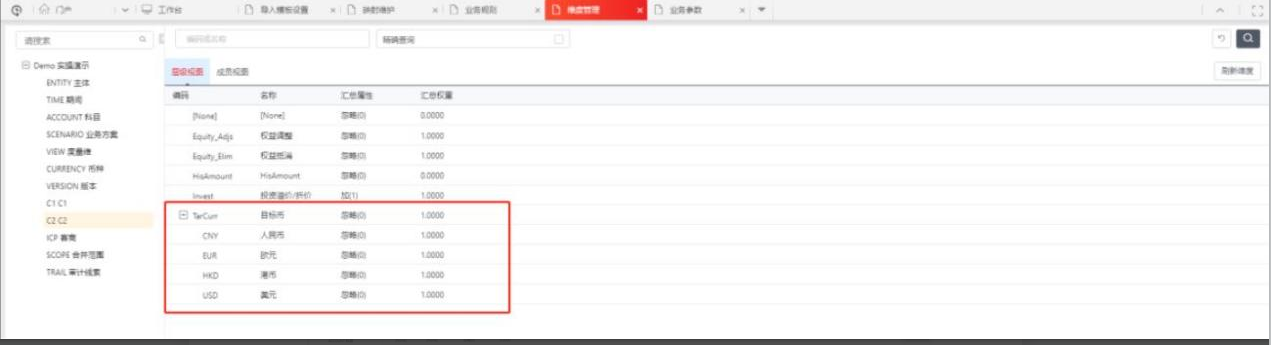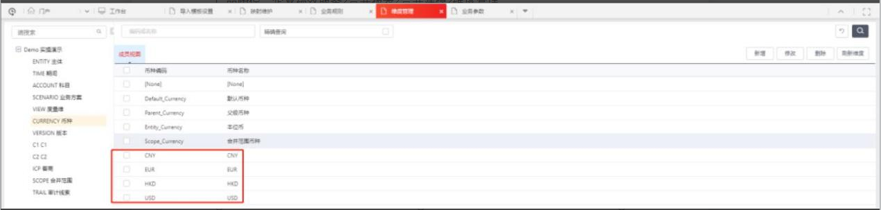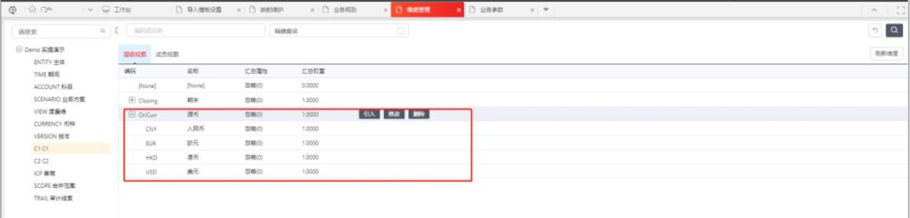 l 维度管理中,币种维度增加币种,并在 C1 维度的 OriCurr 和 C2 维度的TarCurr下,增加相应币种;