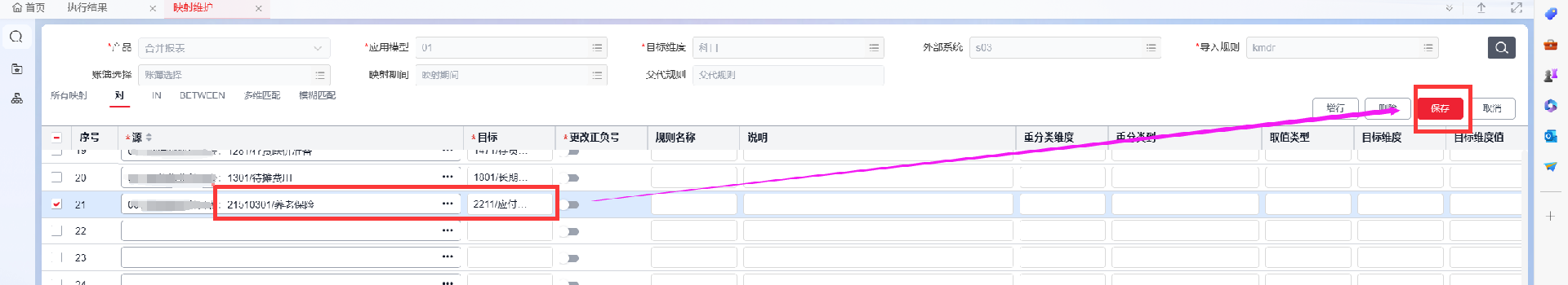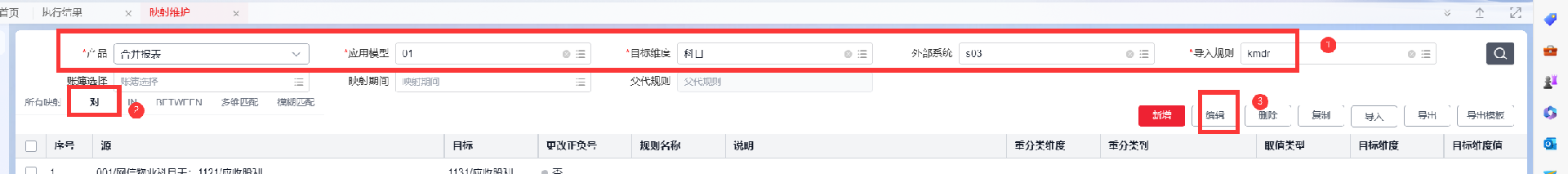 产品:合并报表,应用模型01,目标维度选科目,外部系统选择S03,导入规则选KMDR,进项搜索