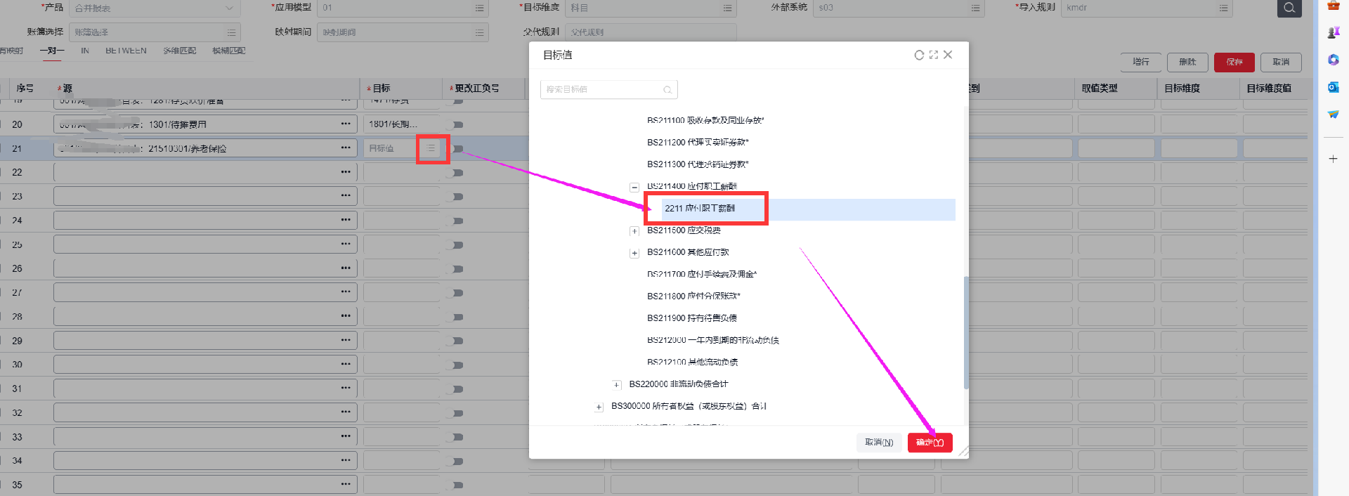 目标里面选择合并报表模块的维度管理的末级科目,比如2211,如果2211在合并报表的维度里面有末级,那必须选末级