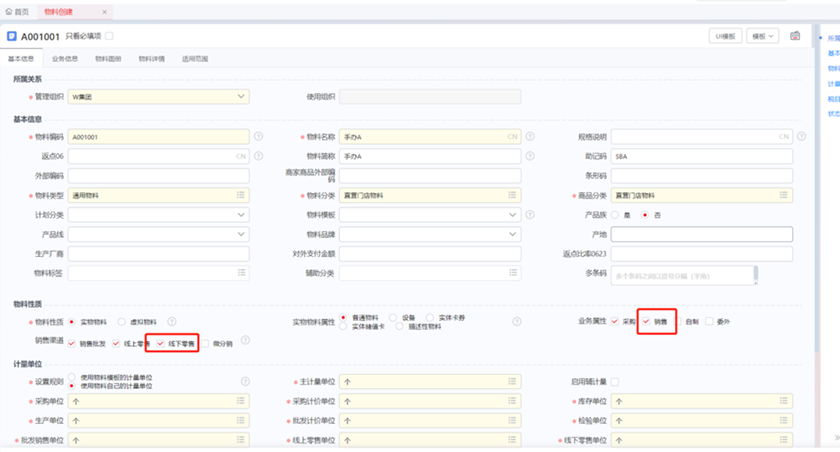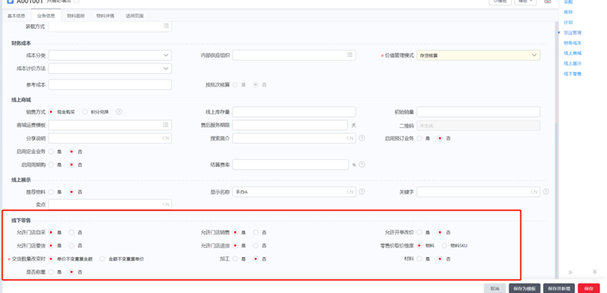 物料的业务属性勾选“销售”,销售渠道勾选“线下零售”。维护“线下零售单位”“要货单位”、“建议零售价”(可为空,用调价单定价)、税目(零售单开电票时使用)、业务信息页签“线下零售”属性。