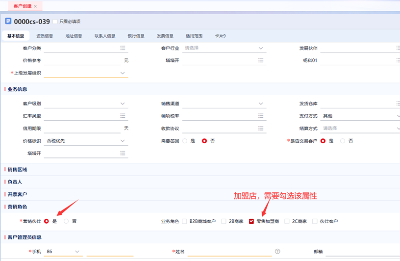 需要为门店建立客户。直营店客户,代表来店消费的客户群体,多个直营店可以使用同一个客户。直营专柜的客户,是专柜所在的商超。加盟店客户,需勾选“营销伙伴”和“零售加盟商”。
