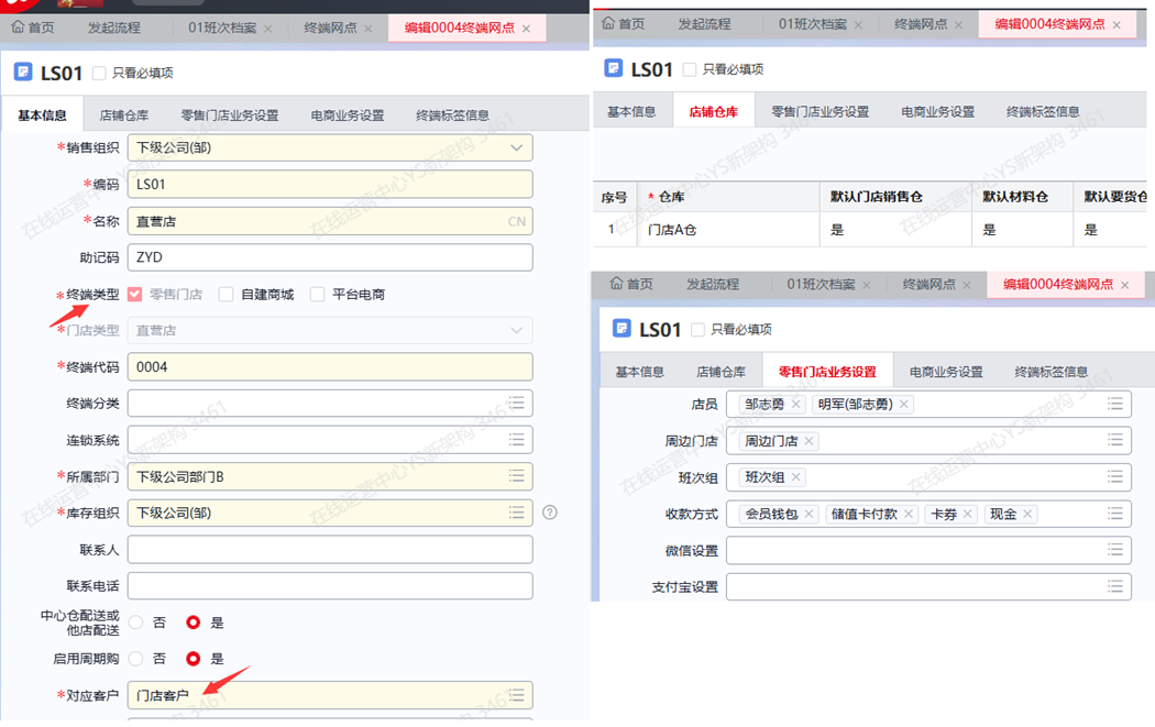 维护门店档案信息;选择对应终端类型,客户,店铺仓库和店员,班次,收款方式等内容。