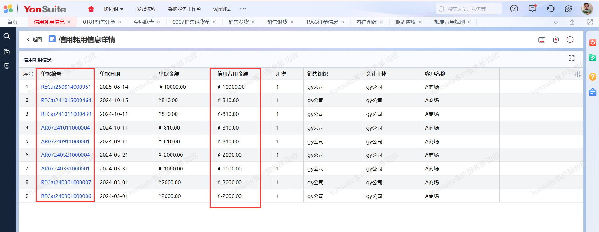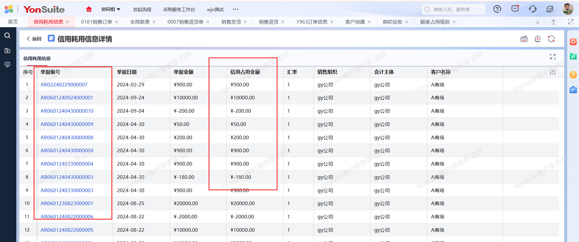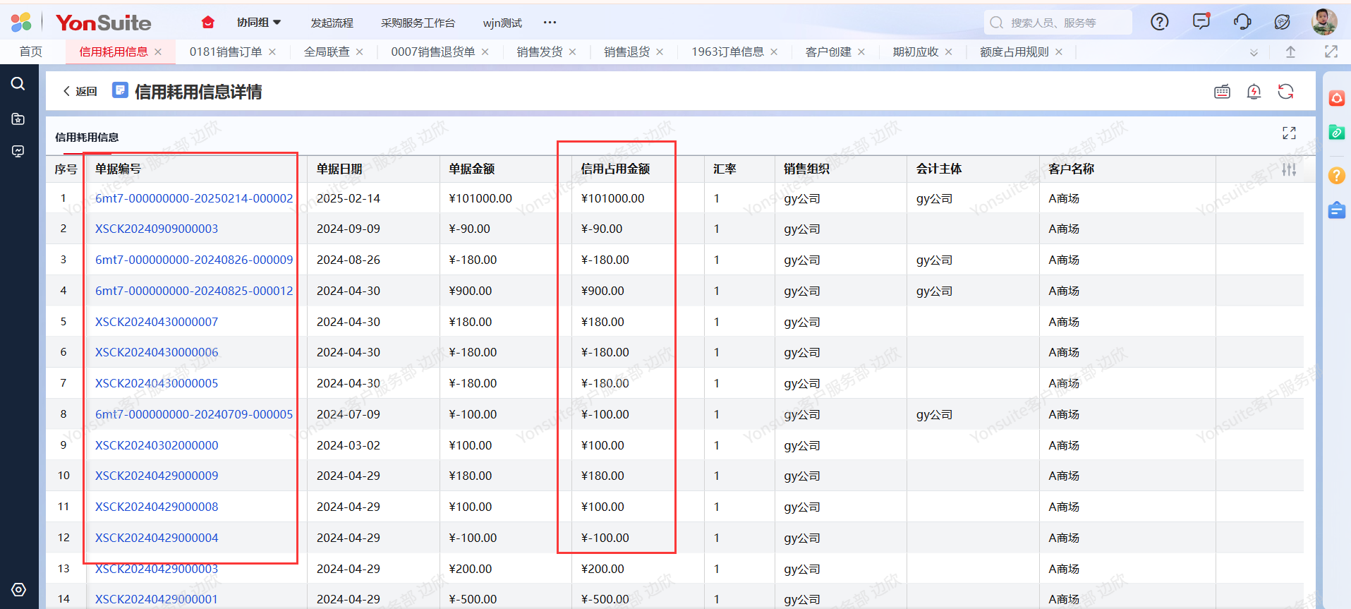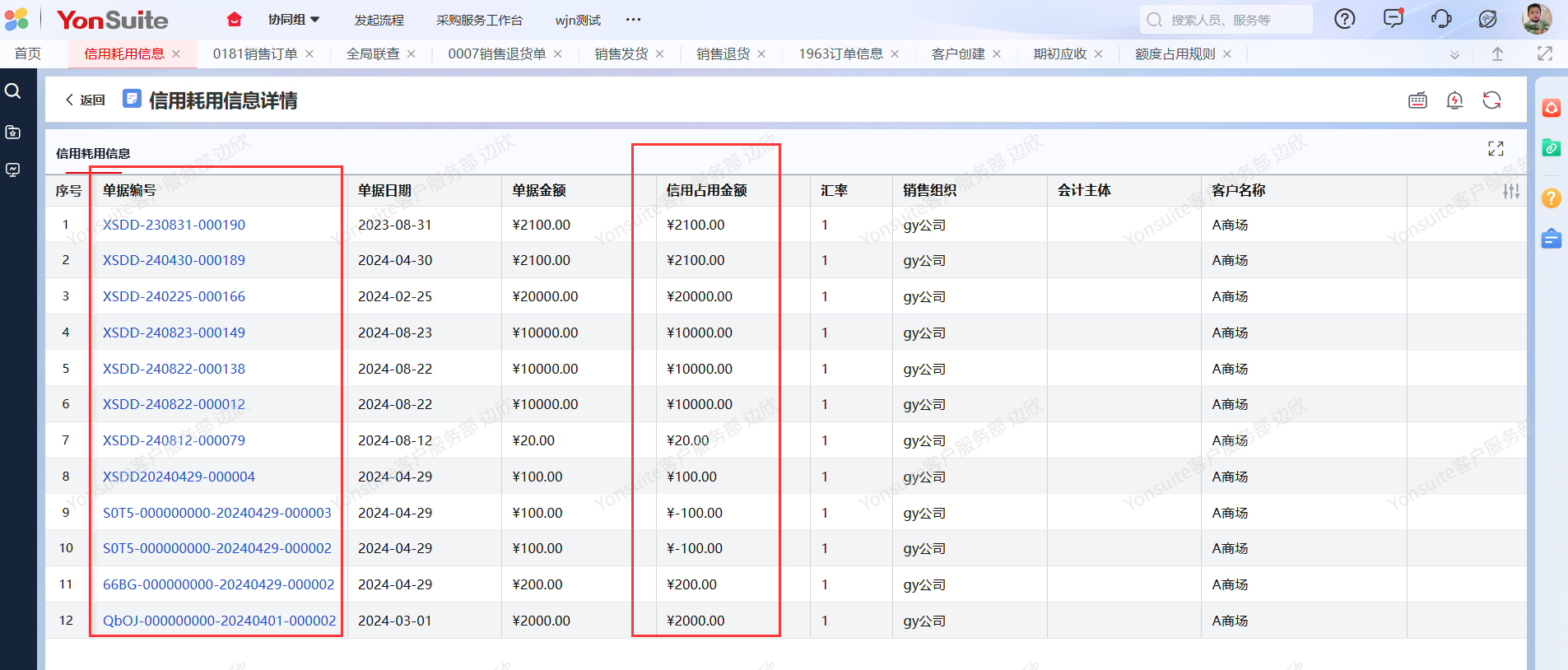 注:在信用耗用查询中可以单击对应的字段数值查看单据明细。