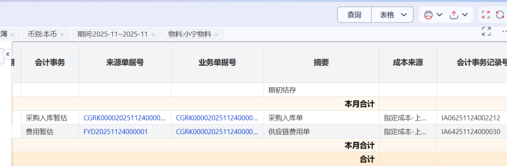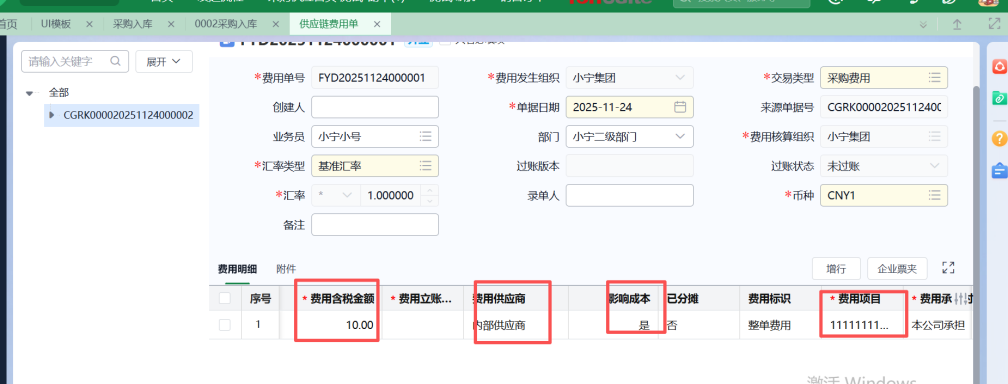 在采购入库单上点击费用,会跳转至供应链费用单