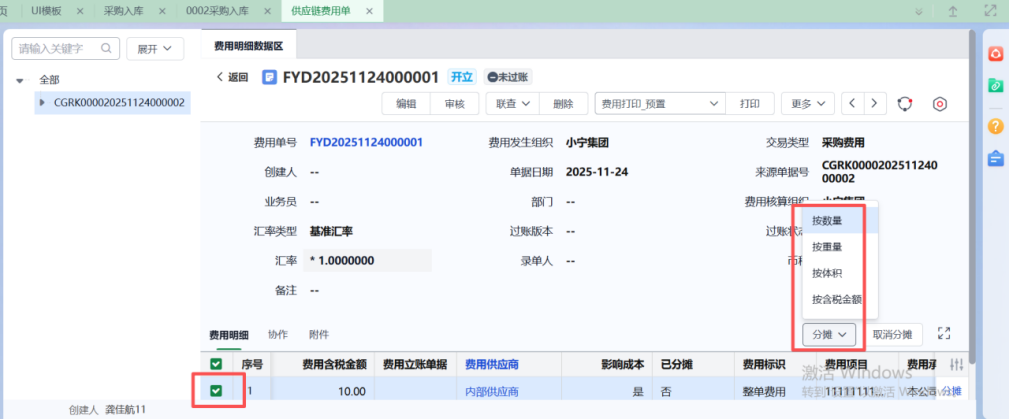 勾选明细,把费用分摊至入库单上,