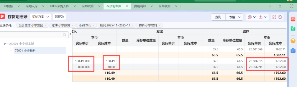 查看存货明细账,费用已经添加至存货成本中